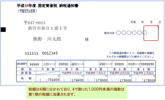この書類は毎年4月の終わりから5月にかけて市役所から送付されるものです。年間固定資産税の金額がわかります。