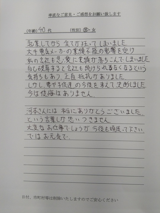 残念ながらその後、奥様とは離婚。養育費や生活費をなるべく渡したいという強い希望により自己破産を決断されました。